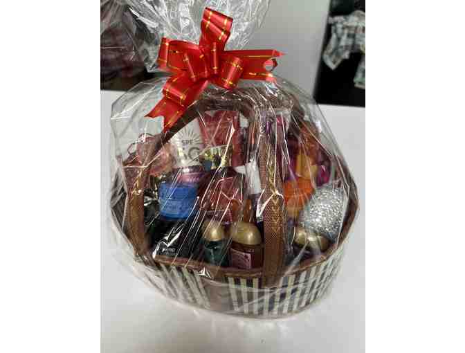 This Bath and Body products basket contains face and body care products. Give yourself an at home spa day with face and lip care, hair mask, and relaxing “Mornings in the Garden” Wallflower room fragrance. As a special bonus, this basket includes the Bridgerton anti-bacterial gel set not found in stores.