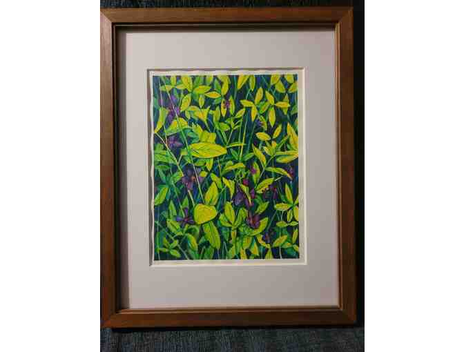 Watercolor painting of a field of violets surrounded by greenery, framed and matted.