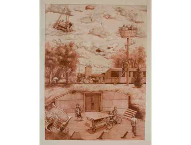 Created during the pandemic, Andrew Fay’s sienna ink drawing is a surreal and meticulously detailed scene that blends the ordinary with the fantastical. Floating machinery, hidden spaces, and curious human activity create an intriguing narrative about the passage of time in an imagined world.