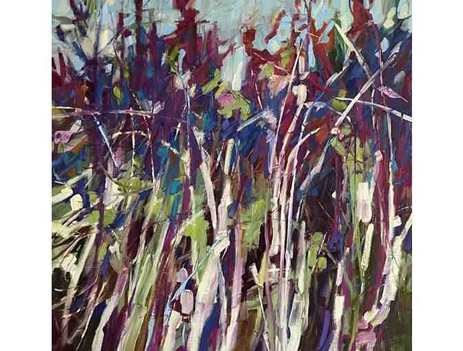 This vibrant semi-abstract painting captures the essence of sunlight bouncing off cotton-grass flower heads at Mer Bleue Bog in Ottawa. Expressive brushstrokes of white, deep purple, and green intertwine, evoking the wild energy of the marsh. The interplay of color and texture creates a dynamic, immersive impression of nature’s brilliance.