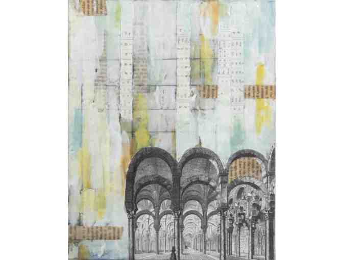 This piece is inspired by old buildings, particularly the visceral feeling of the aging process. The patina, the wear, the layers of paint flaking away all give a sense of persistence, continuity, and of the generations of people who have lived and used these spaces. Encaustic and collage on cradled wood panel.