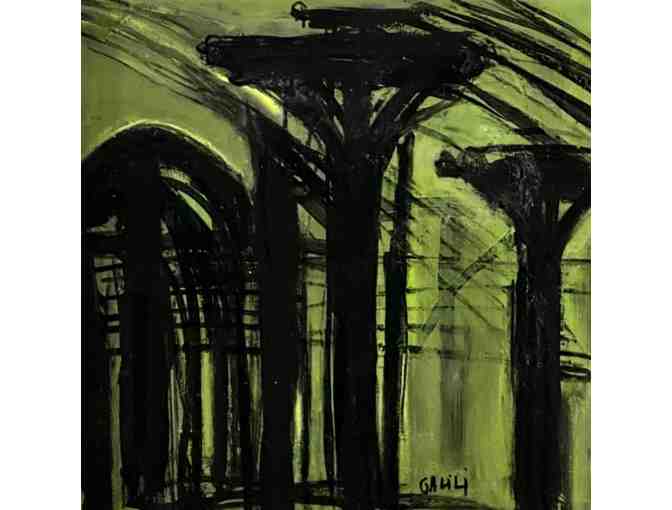 Square Infrastructure : de la série ConneXtions, en noir et vert, allie l’histoire urbaine et la modernité à travers des marques audacieuses et des coups de pinceau. Les lignes noires dessinent des formes architecturales sur fond vert, reflétant le rythme et la structure des paysages urbains, tant passés que présents.