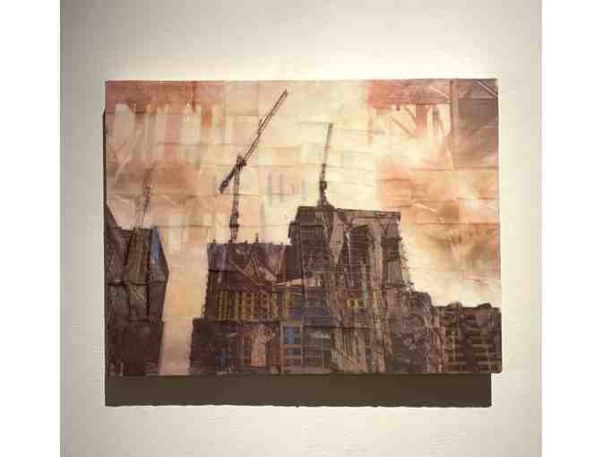 What goes up must come… explore le centre-ville d’Ottawa à l’aide de plusieurs photos et réinvente le paysage changeant du quartier. L’œuvre combine collage et résine, et reconstruit physiquement des images pour créer un nouveau paysage urbain unifié. Le mouvement dynamique de la résine accentue la tension et la fragilité qui se retrouvent au sein du changement continu de la ville.