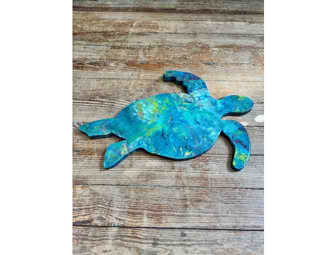 Handmade sea turtle art piece. Epoxy sealed acrylic poured on wood. Created by Livingstone ArtBlends.