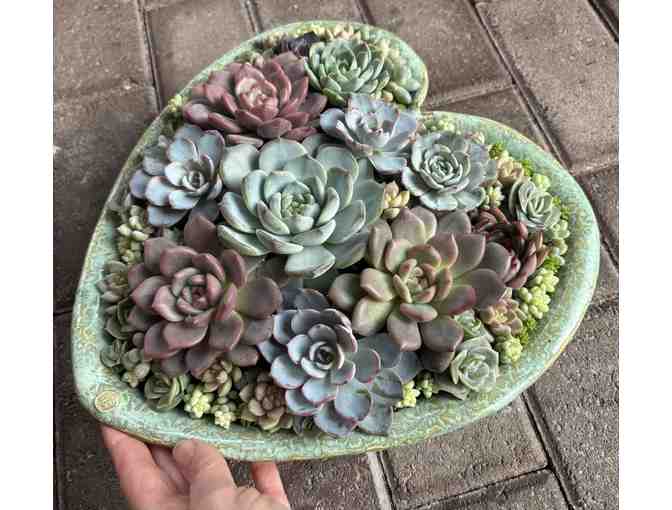 Handmade heart-shaped pottery bowl filled with a selection of succulent plants.