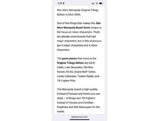 Star Wars Collectible: Rare - published in 2004 (21 years old!) - and out of print. Board Game is factory-sealed, mint condition, never opened. Limited "Trilogy Edition" with 8 Collectible Pewter Pieces. Gift from Milton Bradley CEO at Gaming Convention. Star Wars Themed Monopoly Game - very hard to find. Published by Milton Bradley / Hasbro #42352. Item can be shipped nationwide to Winning Bidder after Auction (with insured shipping) or picked up for FREE in Enfield, CT.