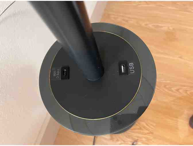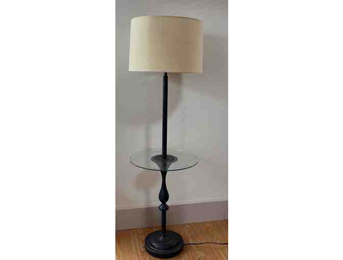 Cal Lighting floor lamp with built in 18" diameter glass tray-table with integrated USB charging ports for type B and C. Max 150W 3-way bulb (LED bulb included), E26 base.