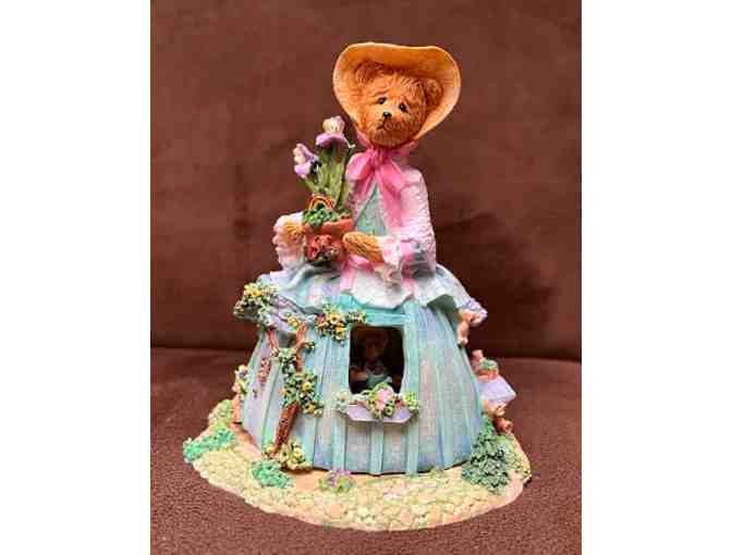 "Kate — The Gardener" depicts a bear dressed in blue and white holding a pot of flowers. Her skirt forms the dwelling, and another bear inside holds a watering can. "She made new magic bloom in the garden in a way it had never bloomed before."
