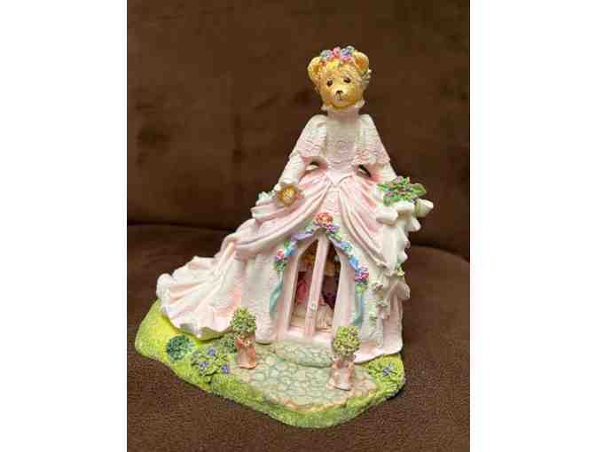 "Irene — The Bride" depicts a bear dressed in a beautiful wedding gown holding a corsage. Her skirt forms the chapel-like dwelling, and inside are two bears helping each other dress for the ceremony. "While it is fashionable for the groom to appear late, it is considered bad manners not to appear at all."