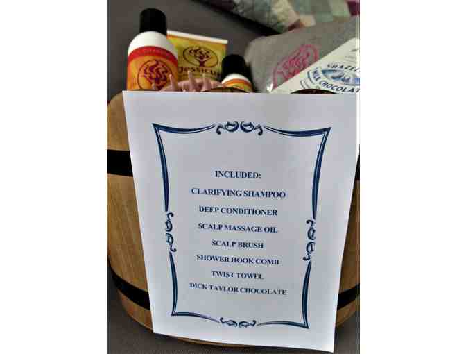 This beautiful basket contains an Exfoliating Scalp Massage Brush, 8 fl. oz. Deep Conditioning Treatment, 2 fl. oz. Stimulating Scalp Massage Oil, 8 fl. oz. Clarifying Shampoo, Microfiber Twist Towel, a white Jessicurl Wide Tooth Comb, and a locally handmade chcolate bar from Dick Taylor Chocolates. The perfect set for indulging and enhancing curly hair care! All products are fragrance-free.