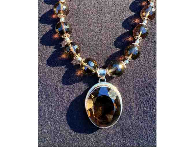 This necklace is beautifully crafted. It is heavy with the weight of both the beads and the silver setting and findings. The pendant stone is a large (heavy) smokey quartz stone encased in silver (stamped (925) indicating sterling silver).