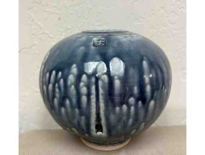 This high-fire porcelain vase has a blue ash glaze, which provides the dark blue colors. The glazes are beautiful on the outside as well as the inside.
