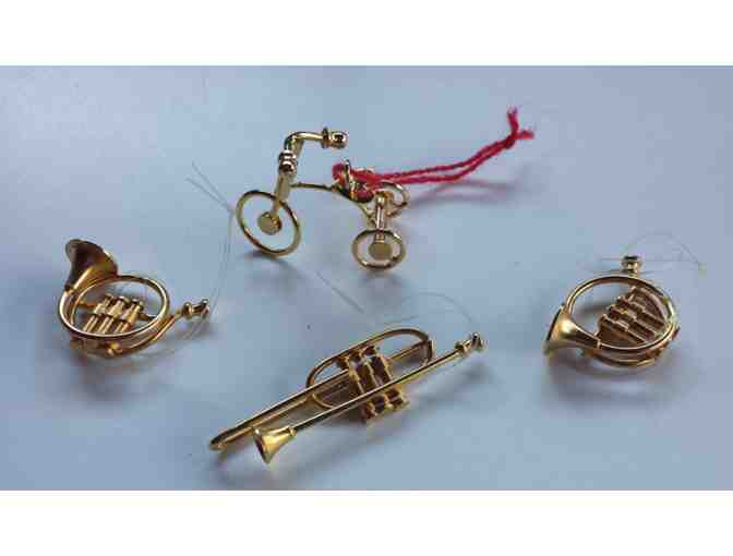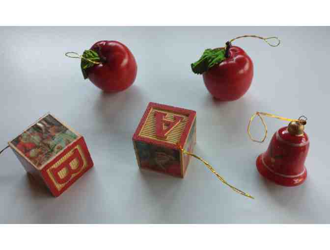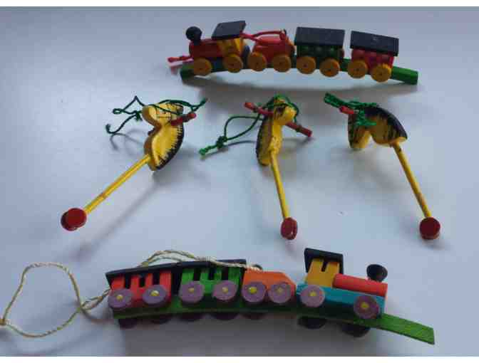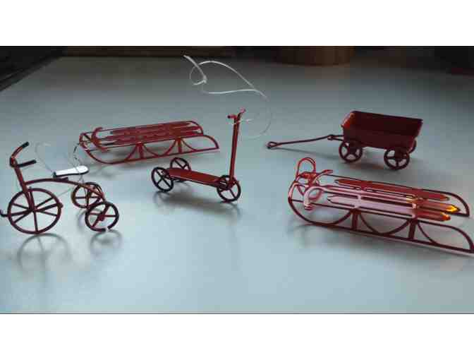 There are wooden ornaments: trains (3), hobby horses (3), apples (2), alphabet blocks (2); Gold-colored ornaments (6), bell, tricycle; Red-metal ornaments: wagon, sleds, tricycles, scooter.
