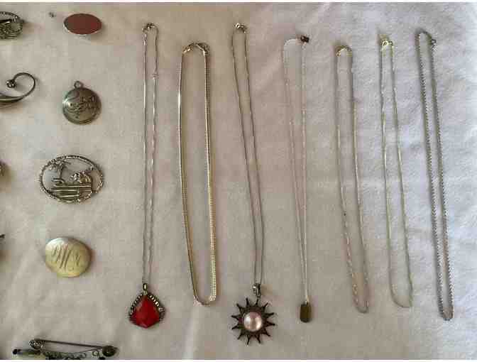 5 Chains, 2 Chains with Pendants, 25 Brooches, many vintage with stones, 9 pair of earrings, 3 single earrings, 44 Total pieces.