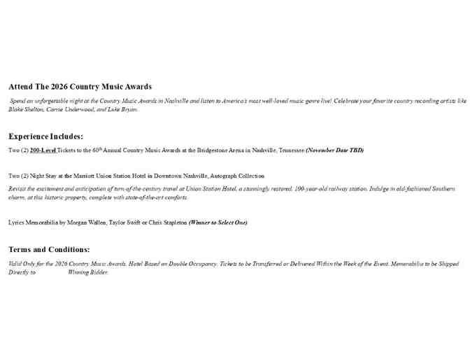 Valid Only for the 2026 Country Music Awards. Hotel Based on Double Occupancy. Tickets to be Transferred or Delivered Within the Week of the Event. Memorabilia to be Shipped Directly to Winning Bidder.