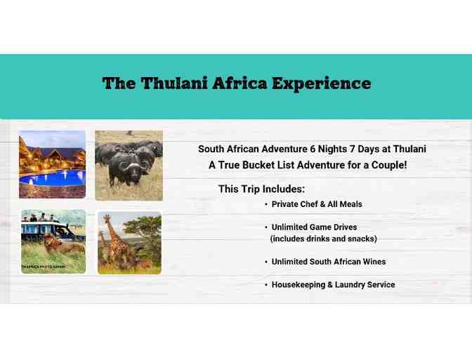 South African Adventure 6 Nights 7 Days at Thulani. A true bucket list adventure for a Couple! This trip includes: Private Chef and all meals; Unlimited Game Drives (includes drinks and snacks; Unlimited South African Wines; Housekeeping & Laundry Service