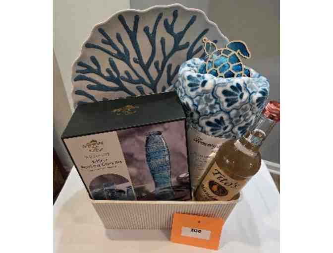 Tommy Bahama plush blanket; sea turtle stained glass ornament; large serving platter; 4-piece stacking glass set