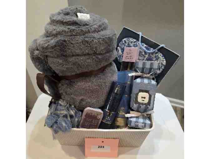 2 weighted therapeutic eye masks; comfy blanket; "Give it to God" prayer box; Aqua Hour spray mist and hand cream; wall charger; lavender and chamomile oil diffuser; loofah