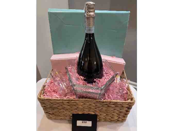 Tiffany & Co. crystal ice bucket; 4 Kate Spade Bubbly glasses; bottle of Prosecco