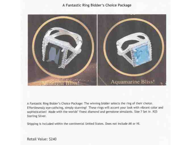 A Fantastic Ring Bidder's Choice Package: The winning bidder selects the ring of their choice. Effortlessly eye-catching, simply stunning! These rings will accent your look with vibrant color and sophistication! Made with the worlds' finest diamond and gemstone simulants. Size 7 set in .925 sterling silver. Shipping is included within the continental United States. Does not include AK or HI.