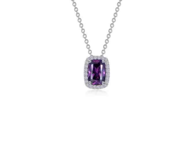 Timeless elegance. This charming halo necklace features a cushion-cut simulated amethyst surrounded by Lafonn's signature Lassaire simulated diamonds. The necklace is in sterling silver bonded with platinum.