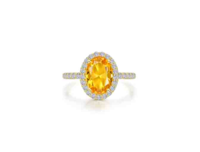 Simple and chic. This charming halo ring features an oval simulated gold nano surrounded by Lafonn's signature Lassaire simulated diamonds. The ring is in sterling silver bonded with gold.