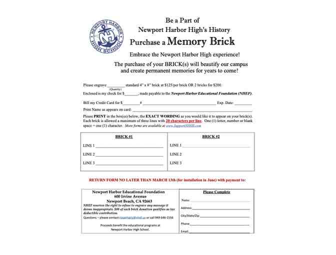 The price for two bricks is $200. If you would like 2 instead, please contact Rosemary Carone at Newport Harbor Educational Foundation: Rosemary@nhef.us