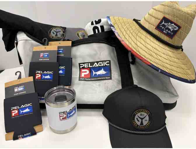 Palegic duffle bag, straw sun hat, sweatshirt, 1 insulated coffee cup, 1 towel, 1 tee shirt, and 1 trucker hat + 3 koozies.