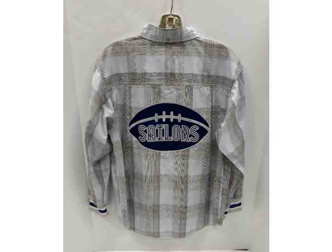 Show your school spirit with this custom women's Newport Harbor button down shirt size medium. Adorned with helmet on the front and a football with "SAILORS" printed on the back, and stylish striped cuffs on the arms.