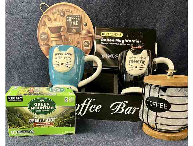 themed coffee mugs, a coffee mug warmer and a cute coffee time plaque.