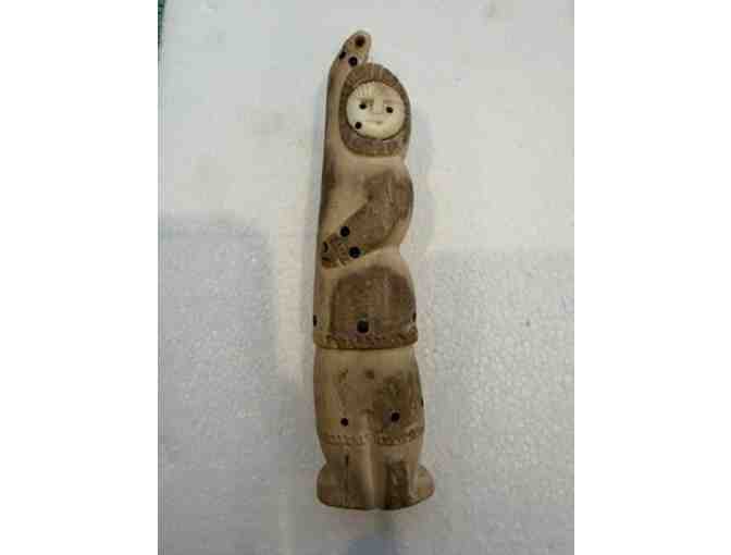 This is a vintage Inuit carving, likely made from whale bone or mammoth bone, featuring baleen inlay to depict a figure in traditional clothing. Approximately 7 inches in height.