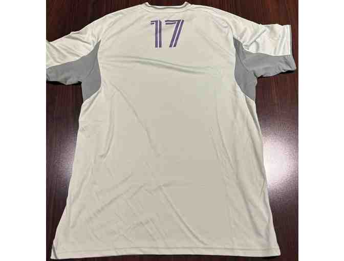 The pre-match top is a size medium. Orlando City wore these pre-match tops during warm-ups before the match on April 26th against Atlanta FC at Inter&Co Stadium.