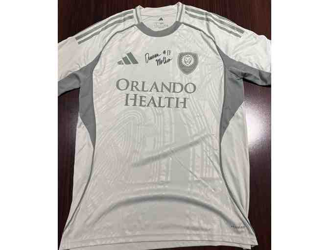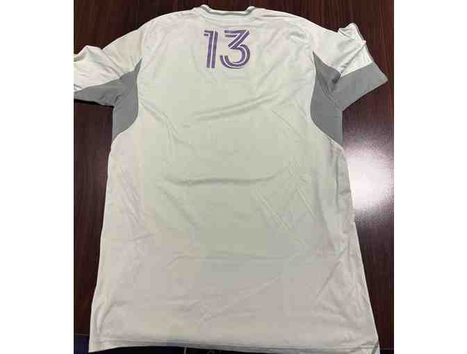 The pre-match top is a size large. Orlando City wore these pre-match tops during warm-ups before the match on April 26th against Atlanta FC at Inter&Co Stadium.