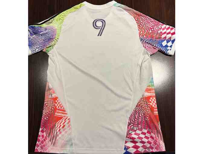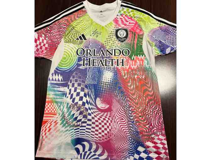 The pre-match top is a size large. Orlando City wore these pre-match tops during warm-up before the match on June 28th against FC Cincinnatti at Inter&Co Stadium.