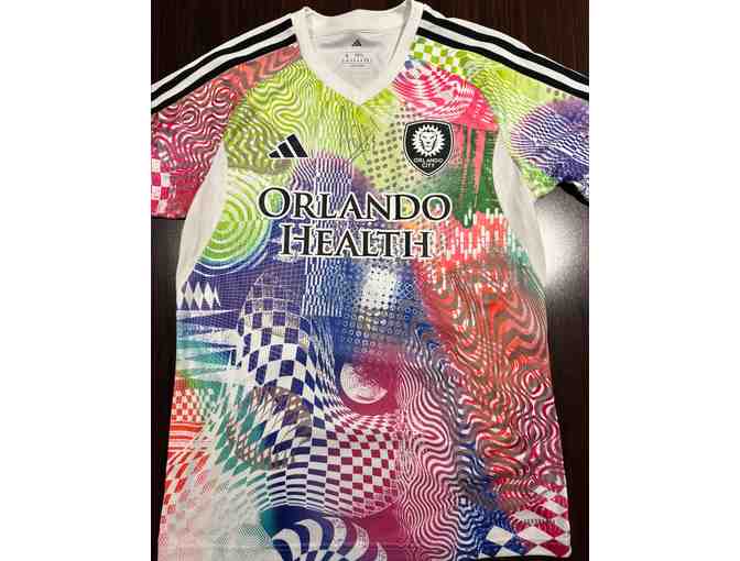 The pre-match top is a size medium. Orlando City wore these pre-match tops during warm-up before the match on June 28th against FC Cincinnatti at Inter&Co Stadium.