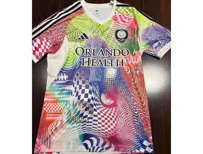 The pre-match top is a size medium. Orlando City wore these pre-match tops during warm-up before the match on June 28th against FC Cincinnatti at Inter&Co Stadium.