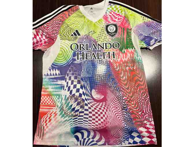 The pre-match top is a size large. Orlando City wore these pre-match tops during warm-up before the match on June 28th against FC Cincinnatti at Inter&Co Stadium.