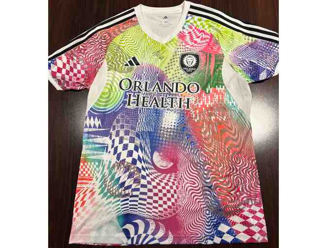 The pre-match top is a size large. Orlando City wore these pre-match tops during warm-up before the match on June 28th against FC Cincinnatti at Inter&Co Stadium.