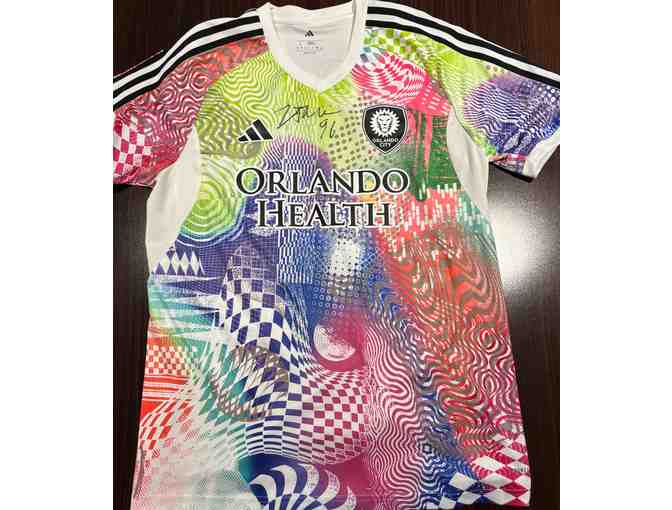 The pre-match top is a size large. Orlando City wore these pre-match tops during warm-up before the match on June 28th against FC Cincinnatti at Inter&Co Stadium.