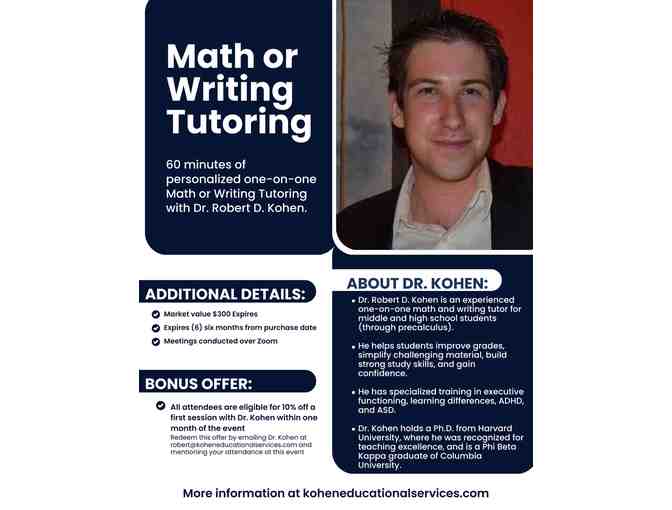 Math or Writing Tutoring (60 minutes) 60 minutes of personalized one-on-one math or writing tutoring for students in middle school through high school (through precalculus) with Dr. Robert D. Kohen. Dr. Kohen has extensive experience helping improve grades, identifying areas for growth, simplifying difficult material, building study skills, motivating students, easing anxiety and instilling confidence. He holds a Ph.D. from Harvard University, where he was recognized with distinction by the Dean of Harvard College for his teaching, and has also taught at The Dalton School. He has completed graduate coursework in instructional strategies for executive functioning, learning differences, ADHD and ASD from Landmark College. He graduated Phi Beta Kappa from Columbia University. More information at koheneducationalservices.com. Additional details: Market value $300. Expires (6) six months from the purchase date. Meetings conducted over Zoom. Sessions are subject to availability. Early booking is recommended for the best chance of securing your preferred time.