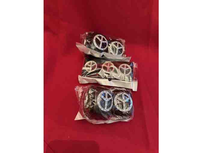 Add a touch of retro charm to your collection with this set of three vintage-style peace sign bracelets. Each bracelet features a bold, circular peace symbol adorned with sparkling rhinestones, creating a perfect blend of classic 1960s spirit and modern shine.