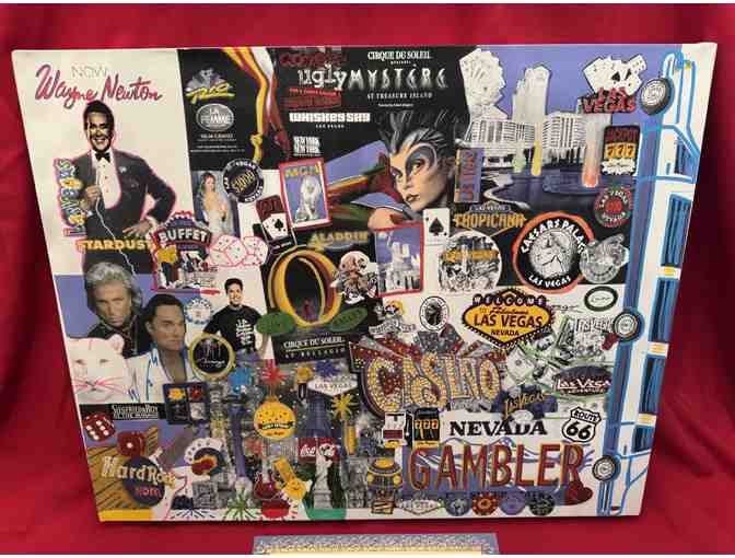 Celebrate the glitz and glamour of Sin City with this dazzling work by Steve Kaufman (SAK), famed protégé of Andy Warhol. This vibrant collage-style composition captures the heart of Las Vegas, featuring iconic imagery such as Wayne Newton, Cirque du Soleil, the Hard Rock Hotel, Caesars Palace, and the legendary “Welcome to Fabulous Las Vegas” sign.