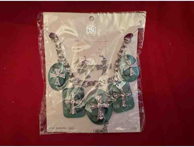 Add a bold, faith-inspired touch to your look with this Nena Creation turquoise cross necklace and earring set. This statement jewelry set features large turquoise-style discs adorned with shimmering silver-tone cross charms.