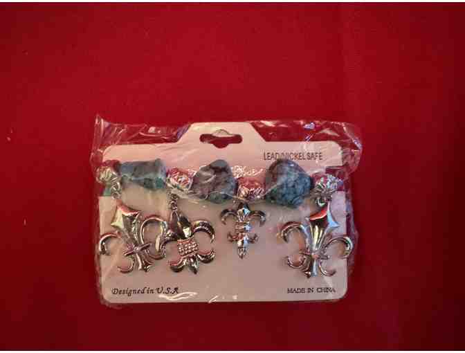 Show off your bold style with this Fleur-de-Lis charm bracelet, featuring striking silver-tone symbols paired with natural turquoise-style stones. This eye-catching piece blends Western flair with elegant French-inspired detailing.