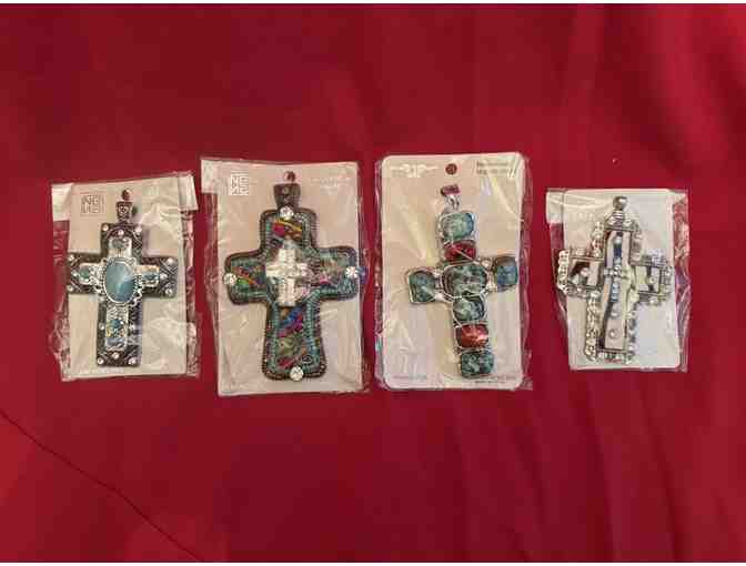 Add a touch of faith and artistry to your jewelry collection with this set of 4 Nena Creation cross pendants. Each piece showcases unique craftsmanship and vibrant detailing — from turquoise-inspired stones to multicolor inlays and sparkling rhinestones.
