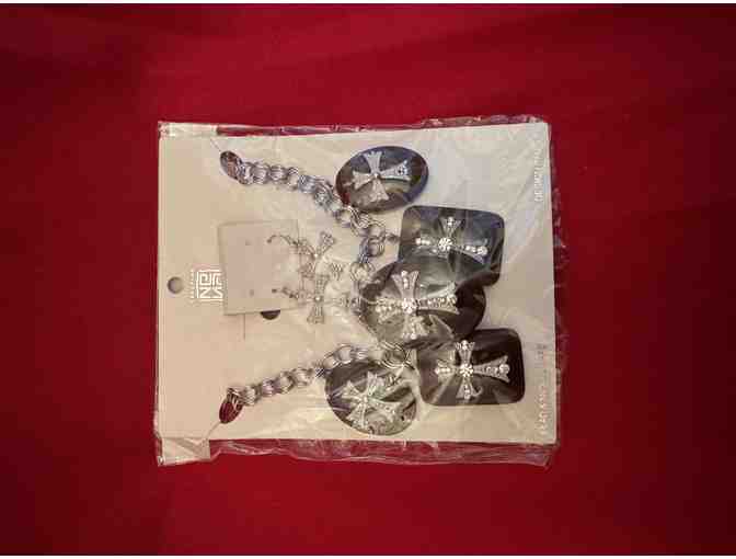 Add bold sophistication to your look with this Noma Creation black cross necklace and earring set. This statement jewelry set features large glossy black discs adorned with sparkling silver-tone crystal crosses.