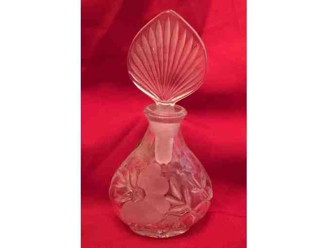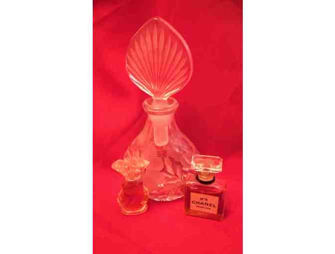 This is a lovely lot of 3 vintage perfume bottles/perfume. The large bottle is a Princess House Heritage Romance Collection etched lead crystal perfum bottle with a fan-shaped stopper. Then we have the iconic miniature Chanel No. 5 Perfume bottle with eau de perfume. Lastly, we have a miniature Jean Louis Vermeil perfume botther with perfume.
