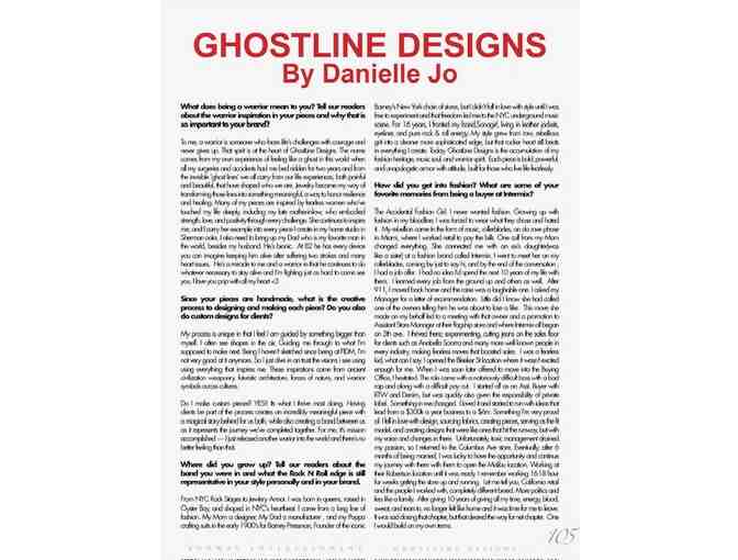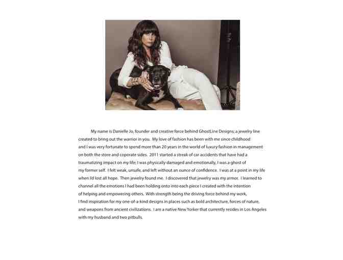 My name is Danielle Jo, founder and creative force behind GhostLine Designs; a jewelry line created to bring out the warrior in you. My love of fashion has been with me since childhood and I was very fortunate to spend more than 20 years in the world of luxury fashion in management on both the store and coporate sides. 2011 started a streak of car accidents that have had a traumatizing impact on my life; I was physically damaged and emotionally, I was a ghost of my former self. I felt weak, unsafe, and left without an ounce of confidence. I was at a point in my life when l'd lost all hope. Then jewelry found me. I discovered that jewelry was my armor. I learned to channel all the emotions I had been holding onto into each piece I created with the intention of helping and empowering others. With strength being the driving force behind my work, I find inspiration for my one-of-a-kind designs in places such as bold architecture, forces of nature, and weapons from ancient civilizations. I am a native New Yorker that currently resides in Los Angeles with my husband and two pitbulls.