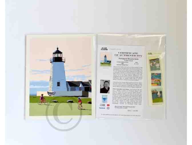 This beautiful 8" x 10" art print by Maine graphic artist Alan Claude entitled Pemaquid Bicycle Girls, features a two girls bicycling around the Pemaquid Point Lighthouse.