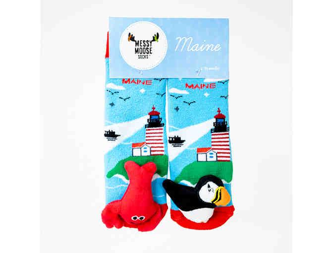 Featuring a lobster and a puffin on the top, these socks are sure to be a favorite of small children. They feature West Quoddy Head Lighthouse and non-skid rubber on the bottoms to prevent your child from slipping on floors.